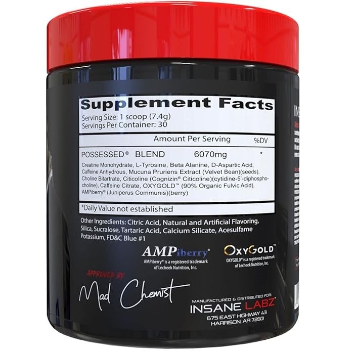If you want a pre-workout that keeps working long after you’re done in the gym, you need Insane Labz’ Possessed. Not only does it get you jacked for a tough workout, but it also helps you put on muscle post-workout. Possessed contains multiple ingredients to get you ready for a grueling workout. It contains two different types of caffeine, citrate and anhydrous, L-Tyrosine, Choline Bitartrate, and Beta-Alanine to get you ultra-focused and boost your workout performance levels. Possessed also adds Creatine and D-Aspartic Acid for increased strength and testosterone levels, helping you add muscle mass and recover quicker. Then to top it all off, we added our patented AMPiberry and OXYgold to increase the absorption and utilization of all the ingredients, making this one potent supplement.